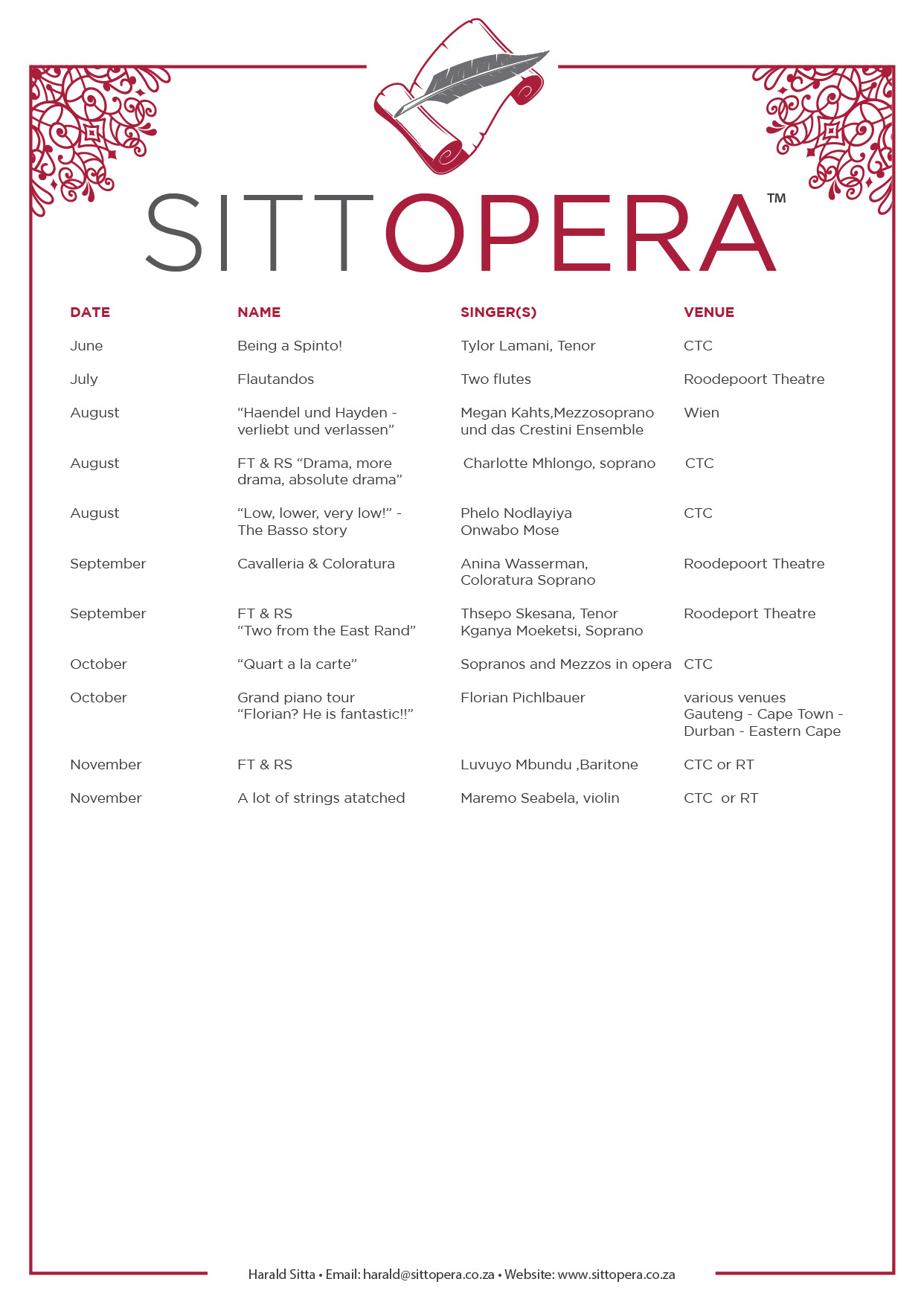 You like to have an event organised? Just CONTACT US or write to harald@sittopera.co.za .Tell us what you like and we inform you what we can do.