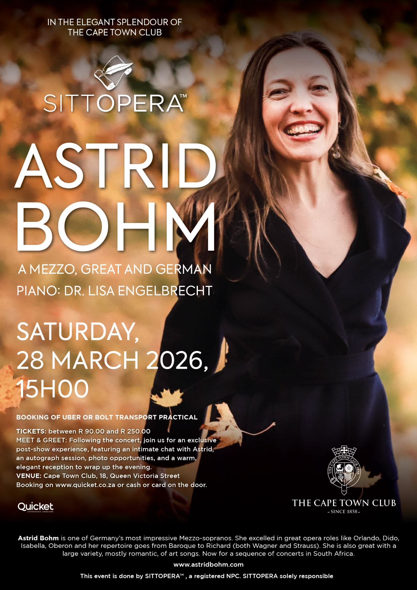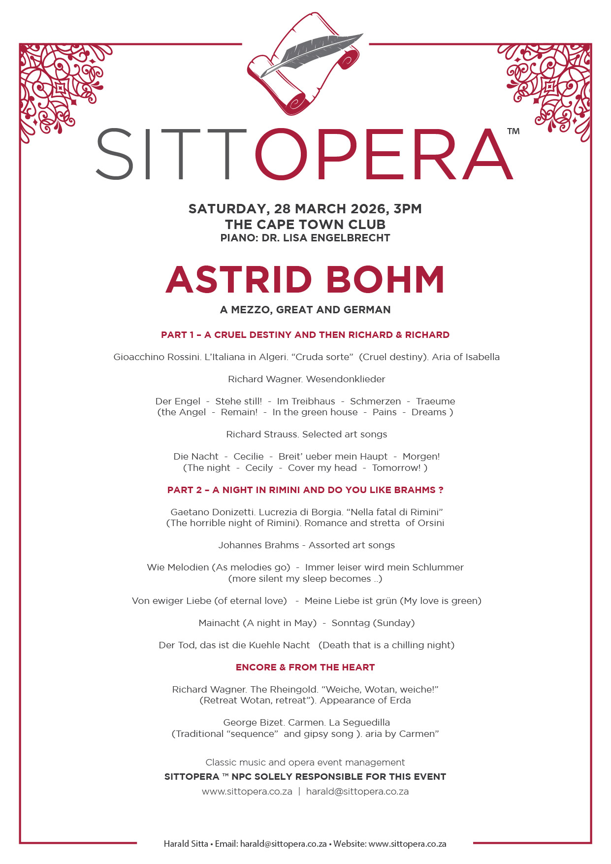 Our next event: We bring an outstanding German Mezzosoprano to South Africa, Astrid Bohm! Two concerts in March and April. We start in Cape Town on the 28.March 2026! An exciting program with Richard Wagner, Richard Strauss, Johannes Brahms & Donizetti , Rossini and Bizet ! An exciting mix.
